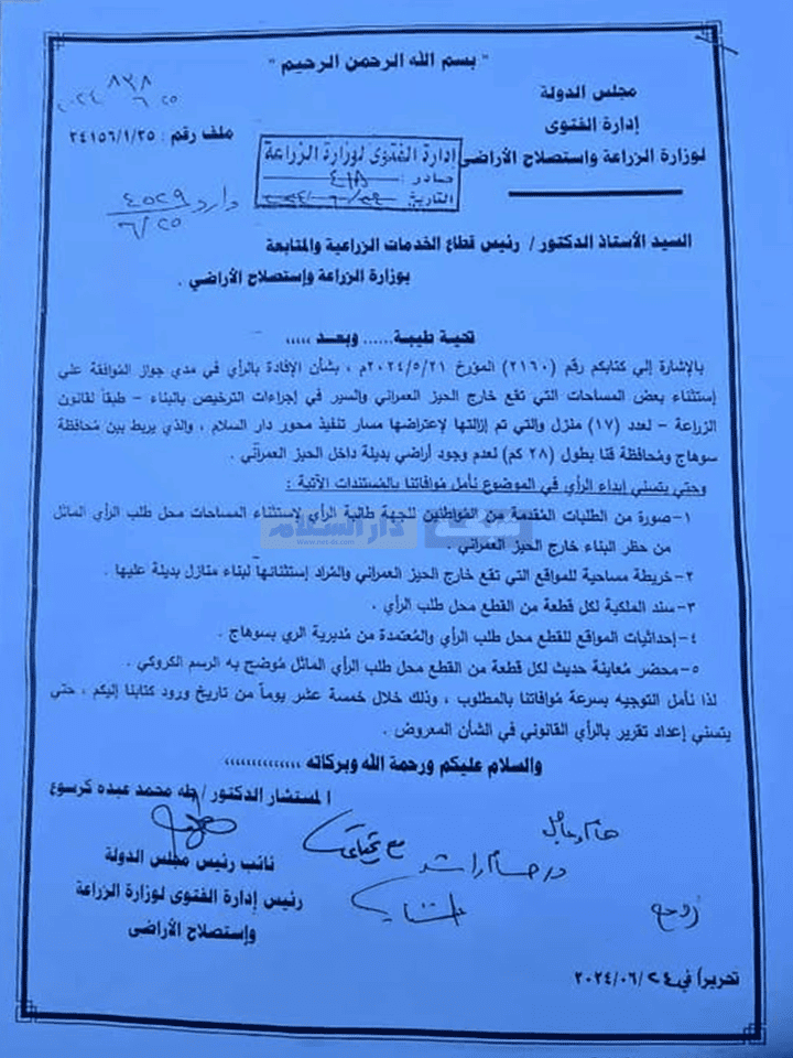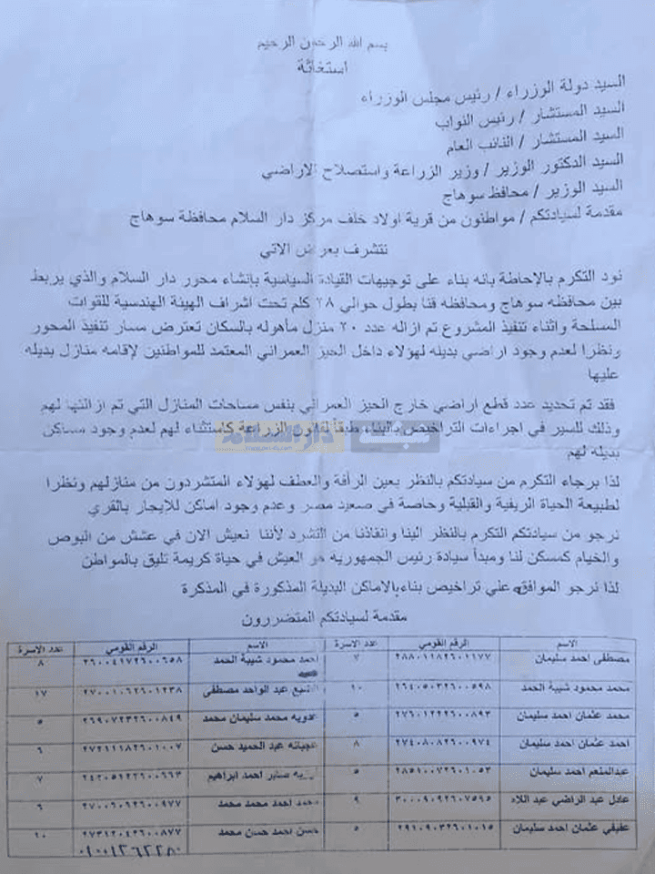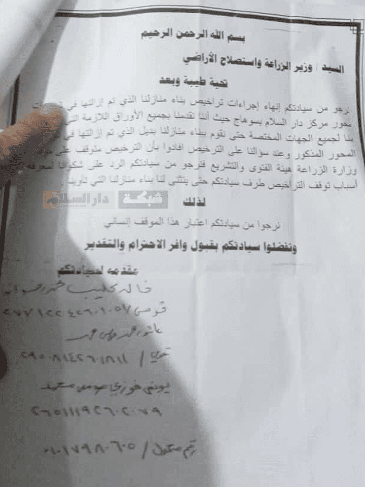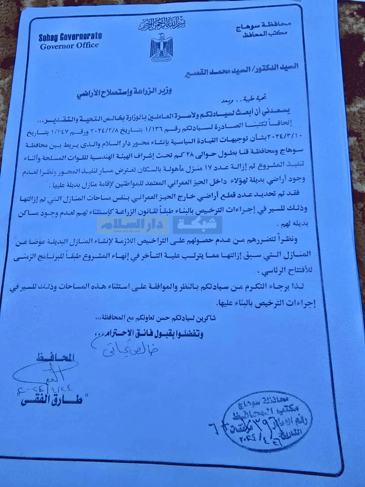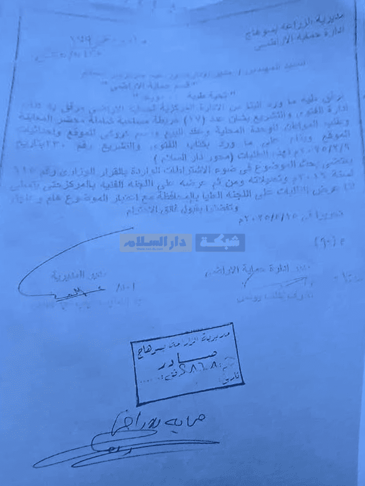 كشفت مستندات حصلت عليها “شبكة دار السلام” أن الملف شهد مخاطبات رسمية منذ فترة سابقة، حيث وجه المحافظ الأسبق لسوهاج، اللواء طارق الفقي، خطابًا رسميًا إلى وزير الزراعة واستصلاح الأراضي، طلب خلاله الموافقة على استثناء قطع أراضٍ مخصصة للمتضررين خارج الحيز العمراني، للسير في إجراءات الترخيص طبقًا لقانون الزراعة.
