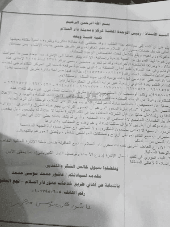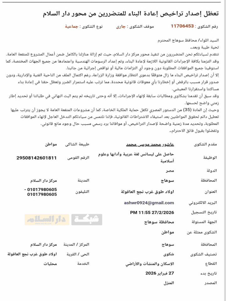 تتواصل معاناة نحو 20 أسرة من أهالي مركز دار السلام، بعد تعطل إصدار تراخيص إعادة بناء منازلهم التي أُزيلت ضمن تنفيذ مشروع محور «البلينا – دار السلام»، رغم استيفائهم الإجراءات القانونية واعتماد الرسومات الهندسية من الجهات المختصة، بحسب ما أكدوه في شكوى رسمية تقدموا بها عبر منظومة الشكاوى الحكومية.
