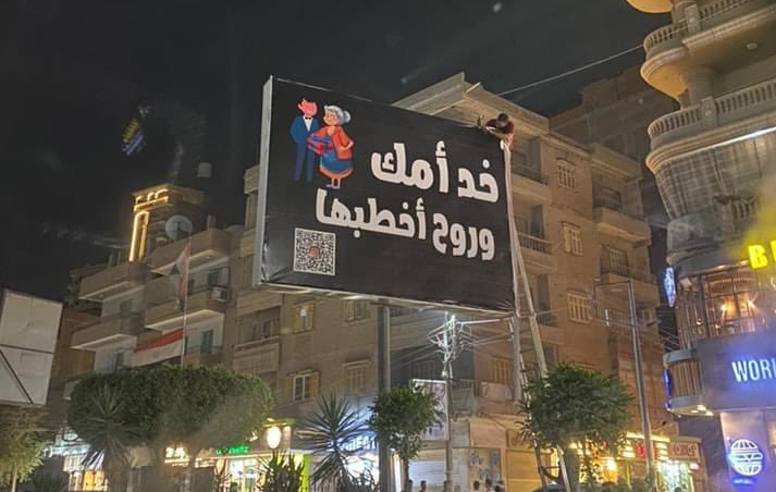 أثار إعلان غريب من نوعه في شوارع مدينة المحلة الكبرى بالغربية بمصر، جدلا كبيرا بعبارته “خد أمك وروح اخطبها” مع صورة كارتونية لشاب وفتاة.